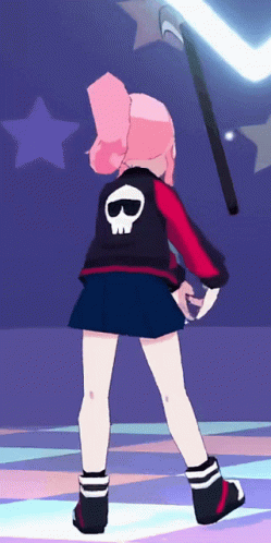 a girl with pink hair has a skull on her back