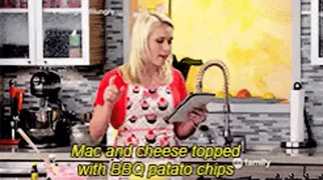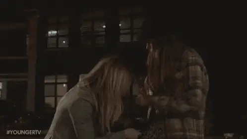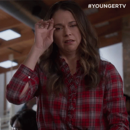 Liza Miller (Sutton Foster) in a plaid shirt, making a gesture to calm herself in a room.