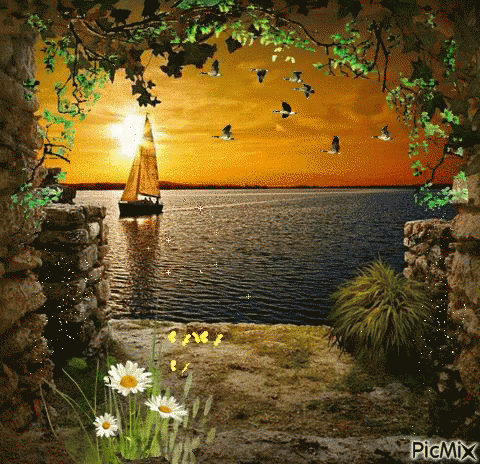 A serene golden sunset over calm water, featuring a sailboat and framed by lush foliage and daisies.