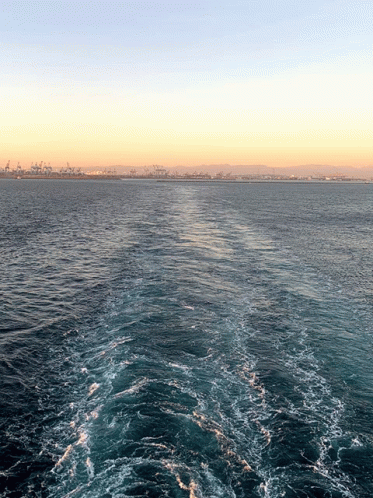 A boat's wake trails across calm water towards a distant city skyline at sunset or sunrise.
