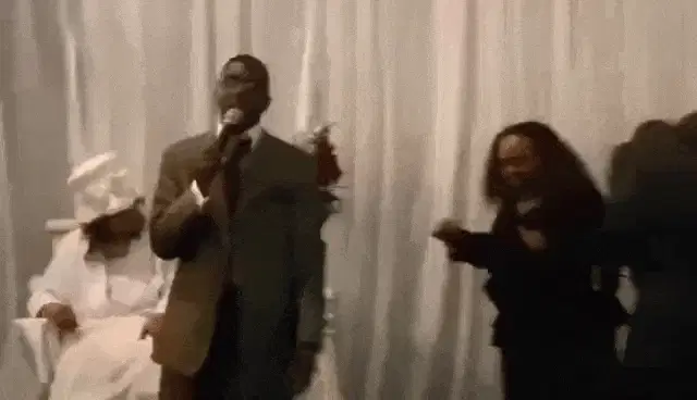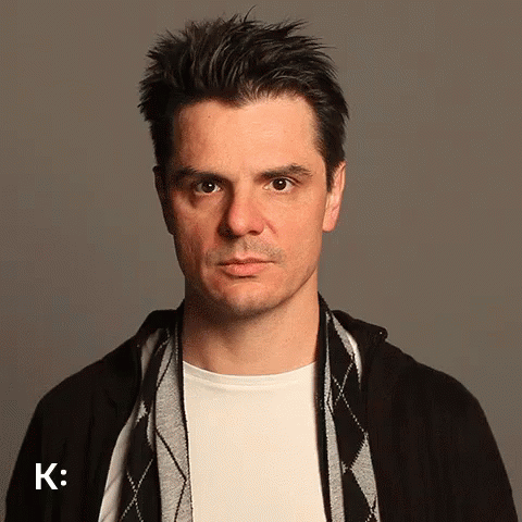 Man with spiky hair makes a 'calm down' gesture, wearing a white shirt and black cardigan.