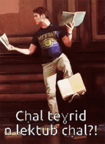 A man in a Michigan shirt struggles to balance multiple books and a box while standing on stairs.