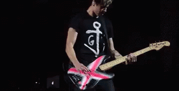 Calum Hood of 5 Seconds of Summer playing a pink bass guitar on stage during a performance.