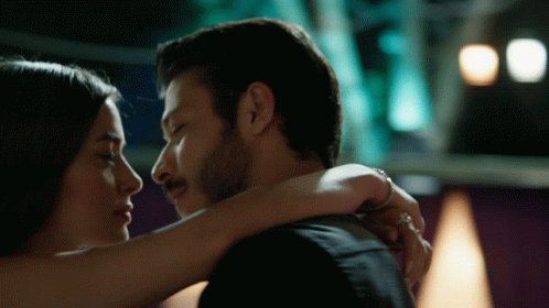 Bensu Soral and Kubilay Aka share a tender embrace in the TV series Cam Tavanlar.
