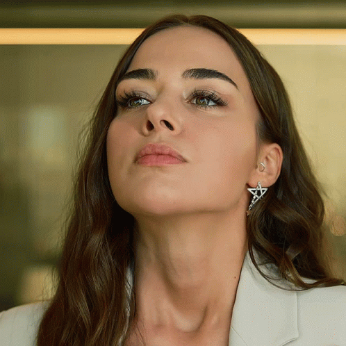 Bensu Soral, from Cam Tavanlar, gazes intently, wearing a white jacket and star earrings.