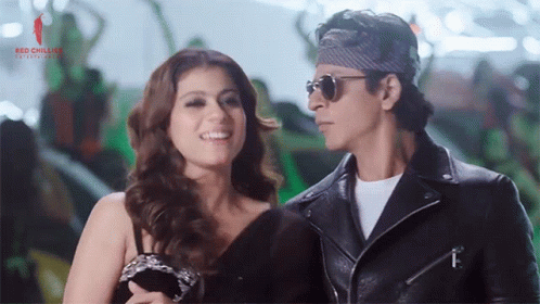 Shah Rukh Khan (Raj Bakshi) kisses Kajol on the cheek in a romantic scene from a Red Chillies film.