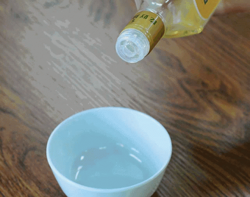 Clear camellia oil being poured from a bottle into a white bowl, ready for cooking.