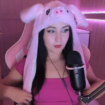 a woman is sitting in a pink chair wearing a pink pig hat and a microphone .