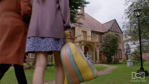 Two women, one carrying a colorful bag, walk towards a grand mansion in a scene from La Nieta Elegida.