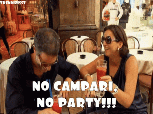 Claudia Obert and a man enjoying drinks at an outdoor cafe, declaring 'No Campari, No Party!!!'