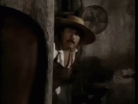 A campesino farmer with a mustache and straw hat peeks from behind a large wooden barrel in a rustic setting.
