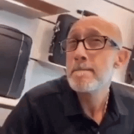 Bald man with glasses and beard gives an intrigued, 'Can I Get Uhhh' look in a store.