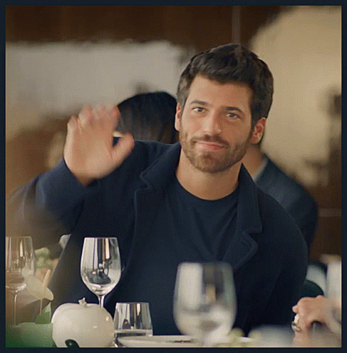 Can Yaman waves and smiles charmingly in a De Cecco commercial, seated at a dining table.