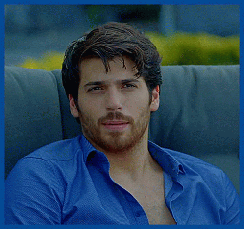 Can Yaman as Ferit Aslan from Dolunay, smiling softly while sitting on a couch in a blue shirt.