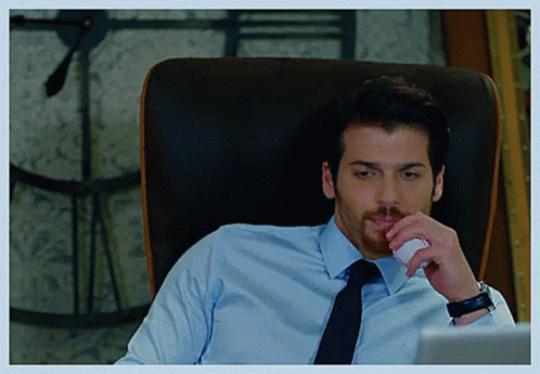 Can Yaman as Ferit Aslan in Dolunay, deep in thought while holding a stress ball at his desk.