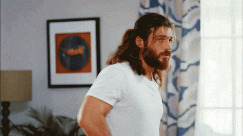 Turkish actor Can Yaman adjusts his long hair, looking directly at the camera in a casual setting.