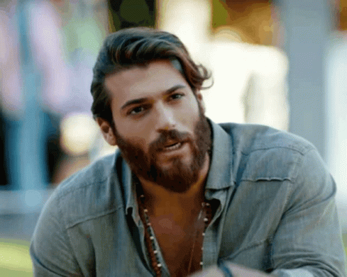 Can Yaman, the handsome Turkish actor, with long hair and a beard, gesturing while talking.