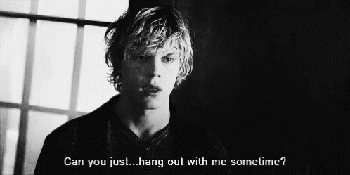Evan Peters as Tate Langdon from American Horror Story asks, 'Can you just... hang out with me sometime?' in a black and white scene.