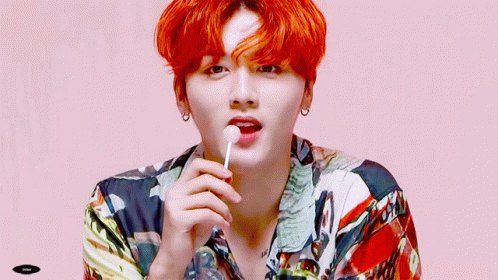 SF9's Youngbin with vibrant red hair, enjoying a sweet candy lollipop against a pink background.