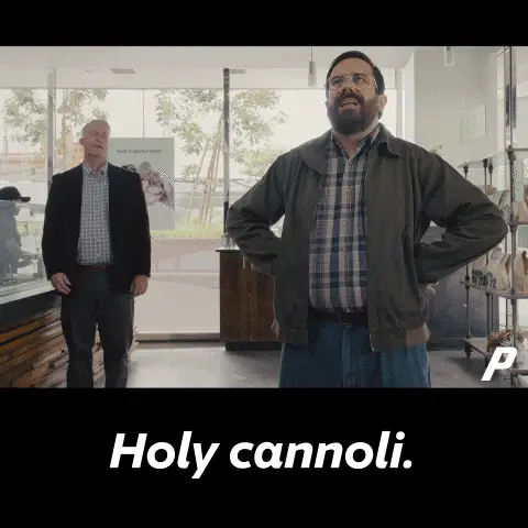 A close-up of a beautifully prepared Sicilian cannolo, topped with cream, fruit, and powdered sugar, on a white plate.