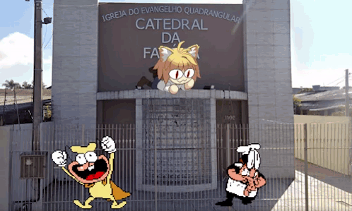 a cartoon character stands in front of a building that says igreja do evangelio quadrangular