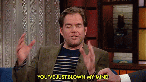 Stephen Colbert reacts with an emphatic 'You've just blown my mind' on a talk show, gesturing dramatically.