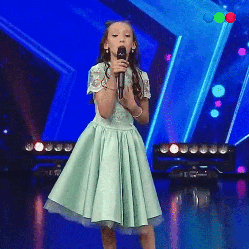Young singer Maria Belen Manos performs on stage with a microphone, showcasing her talent.