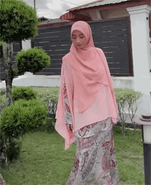 A young woman in a pink hijab and a red patterned dress sways gently, posing for the camera.