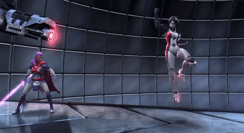 a video game scene with a robot and a superhero fighting each other