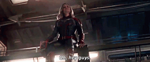 Captain Marvel (Brie Larson) greets everyone with 'Oh, hey guys' while sitting in her superhero suit.
