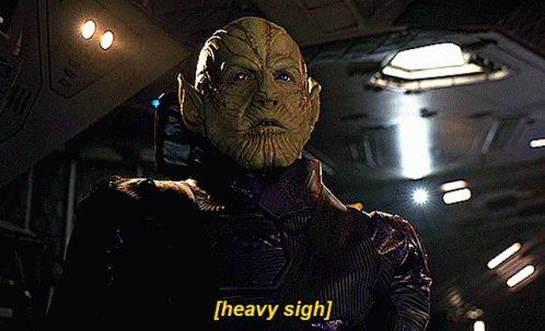 Talos from Captain Marvel lets out a heavy sigh, portrayed by Ben Mendelsohn.