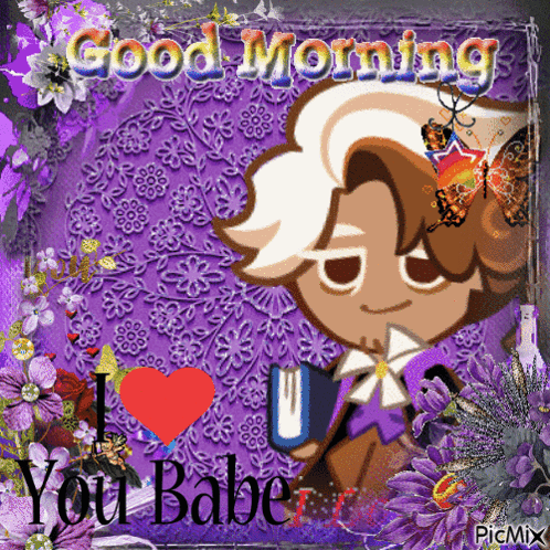 Capuccino Cookie from Cookie Run Kingdom wishing 'Good Morning' with a heartfelt 'I Love You Babe!' message.