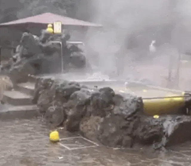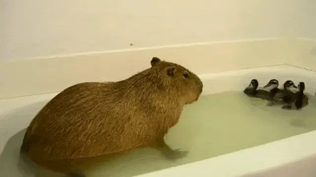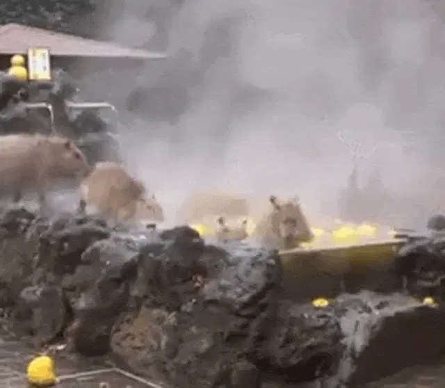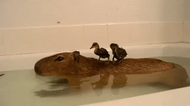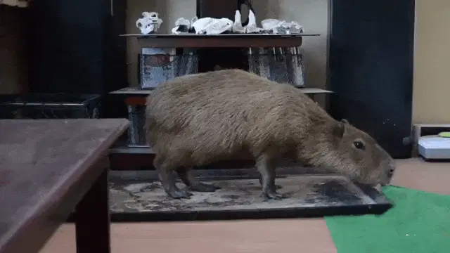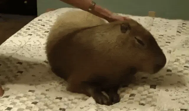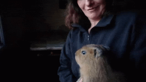 A person gently holds and pets a small capybara, with another person visible in the background in a dimly lit setting.