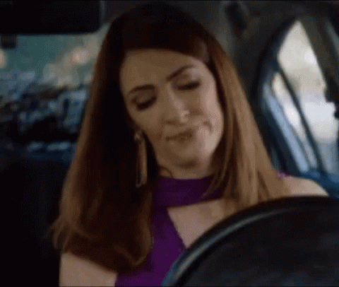 A woman in a purple dress reacts with a shocked expression in a car, while a woman in the back seat smiles.