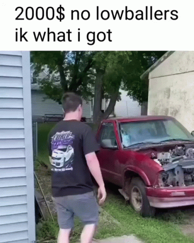 A man attempts to sell a dilapidated red pickup truck for $2000, stating 'no lowballers ik what i got'.