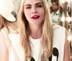 Cara Delevingne makes a rock-and-roll hand gesture, sticks out her tongue, and looks at the camera.
