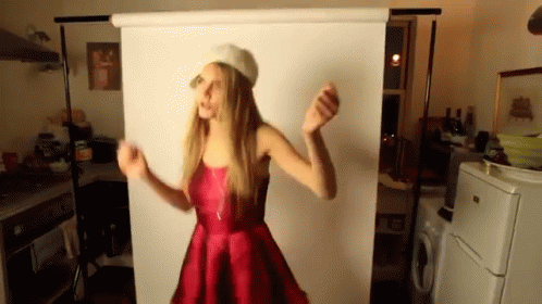 Cara Delevingne shows off her goofy and silly dance moves in a red dress and white hat.