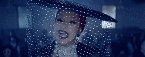 Cardi B in a striking black hat with a dotted veil and sparkly choker, from her 'Careful' music video.