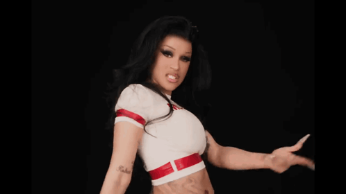 Cardi B in a white crop top with red trim, featuring 'Nicki Minaj' text, posing against a black background.