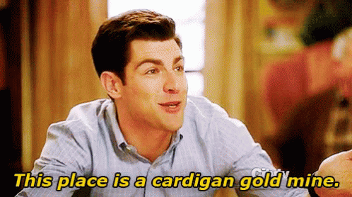 Max Greenfield as Winston Schmidt from New Girl exclaims about a "cardigan gold mine."
