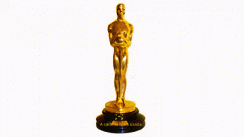 An Oscar statue surrounded by colorful balloons, with the text 'A carinha triste usada' on its base.