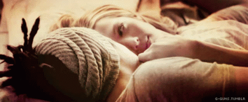 A woman lies on a man's shoulder, receiving a gentle caress, in a moment of tender affection.