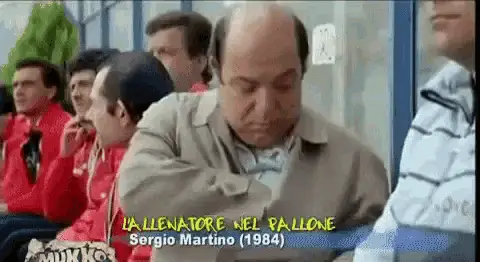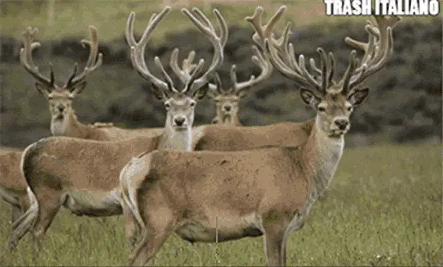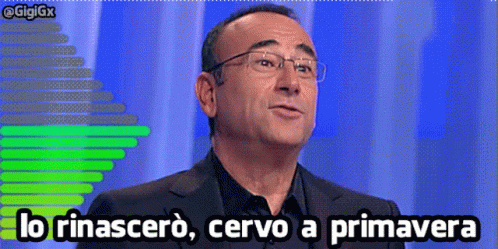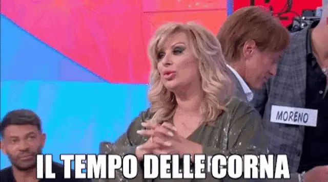 Italian TV host Carlo Conti makes the 'corna' gesture while the caption 'Cervo a primavera' appears.