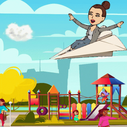 Caro Guinazu, a Local Guide, joyfully flies on a paper airplane over a vibrant playground.