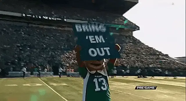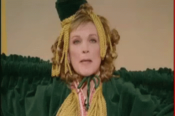 Carol Burnett in a distinctive green and yellow doll-like costume, sitting up and opening her eyes.