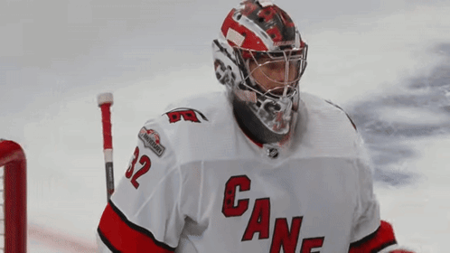 Carolina Hurricanes goalie Antti Raanta on the ice, celebrating with teammates after a game.
