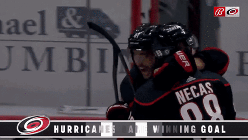 Martin Necas of the Carolina Hurricanes celebrates scoring the game-winning goal against the Boston Bruins.