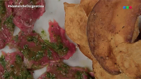 A plate of Carpaccio with herb sauce and french fries from Masterchef Argentina, Episode 43.