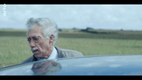 a man with gray hair and a mustache is standing in front of a field