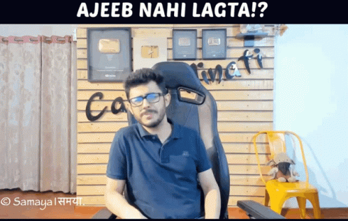 Carryminati (Ajey Nagar) sits in his gaming chair, asking 'Doesn't it feel strange!?' in his YouTube setup.